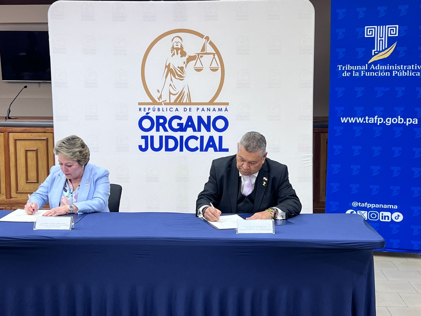 El acuerdo, firmado por la magistrada presidenta de la Corte Suprema de Justicia, María Eugenia López Arias, y el magistrado presidente del TAFP, Carlos Ayala Montero, busca, además, unir esfuerzos técnicos, académicos y tecnológicos entre ambas entidades para elevar la eficiencia, la formación del recurso humano y la calidad del servicio a la ciudadanía.