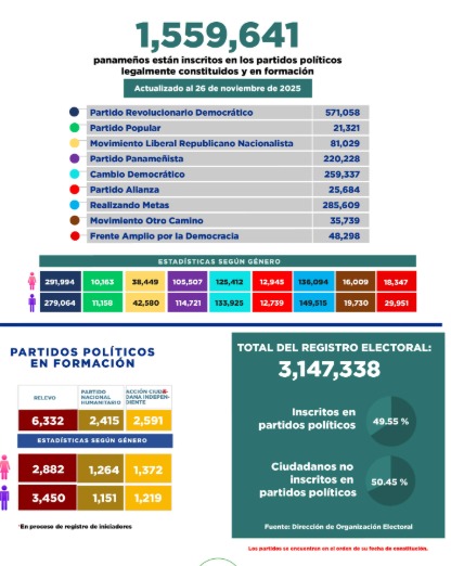 Hasta este jueves 26 de noviembre de 2025, la Dirección Nacional de Organización Electoral (DNOE) reportó que un total de 1,559,641 panameños se han inscrito en los diferentes partidos políticos legalmente constituidos y en formación.