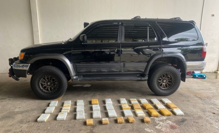 La Policía Nacional decomisó 35 paquetes rectangulares de presunta droga y aprehendió a dos personas: un hombre panameño de 27 años y una mujer costarricense de 28 años, tras la verificación a un vehículo en el Puesto Integral de Guabalá, ubicado en el distrito de Tolé, provincia de Chiriquí.