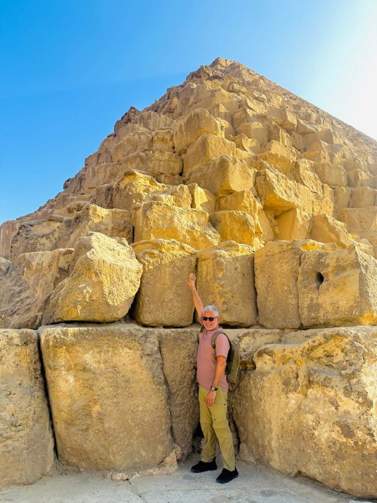 El día que me correspondía el tour a las pirámides no tuve la compañía de otros turistas así que fui privilegiado con un guía exclusivo; Mohamed Derbala, un egipcio apasionado por su trabajo, que me mostró y contó cada detalle sobre la historia de las tres grandes pirámides en la meseta de Guiza. De la de Keops me dijo: que es la más grande, que su construcción duro cerca de 40 años y que corresponde a la tumba del faraón Keops, construida con bloques de piedra caliza y orientada hacia los cuatro puntos cardinales.