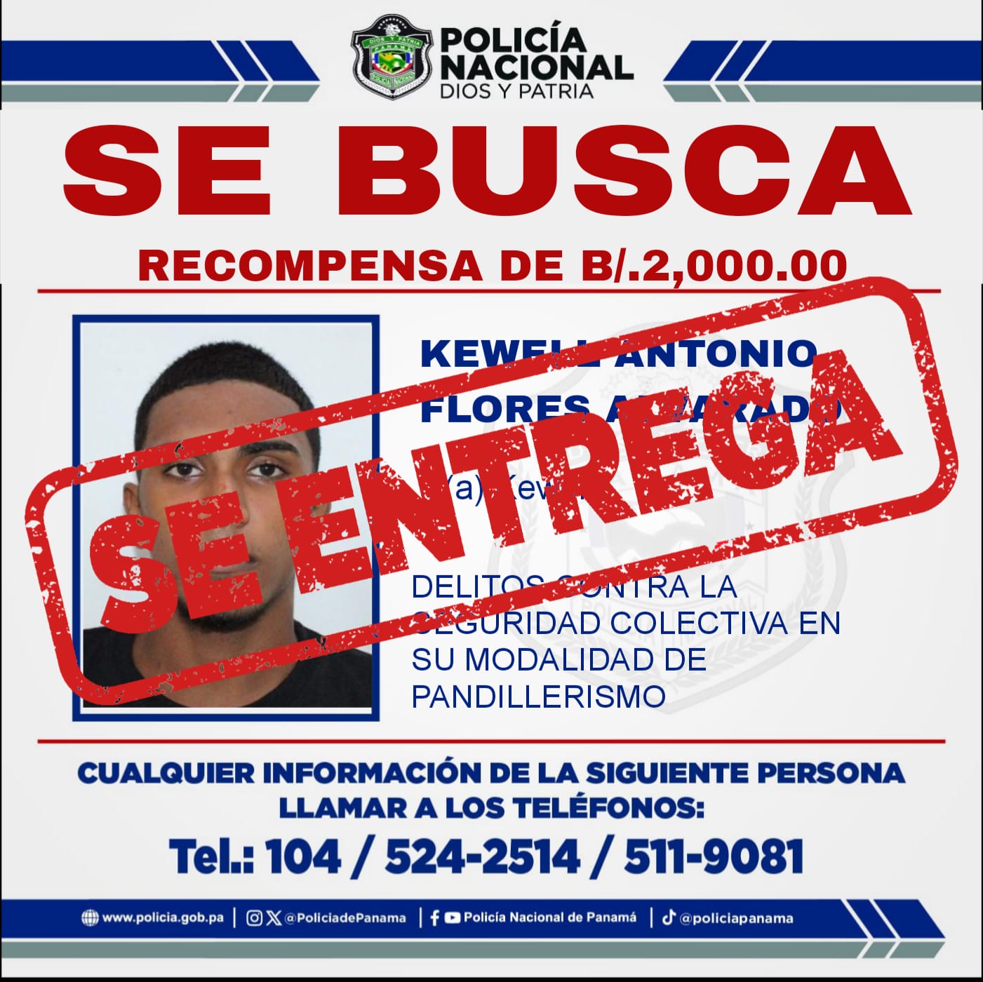 La Policía Nacional a través de la Dirección de Investigación Judicial hizo efectiva la aprehensión de Kewell Antonio Flores Alvarado, quien figura en la lista de los más buscados por delitos contra la seguridad colectiva en su modalidad de pandillerismo.