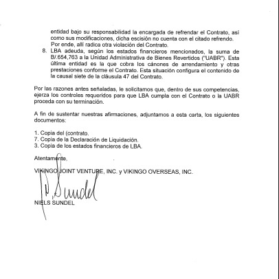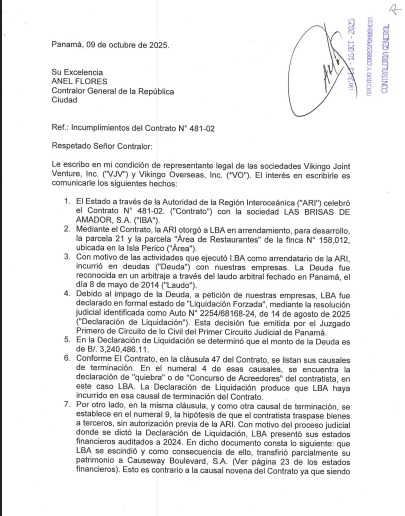 En nota fechada 9 de octubre de los corrientes, se alerta al contralor Anel Flores sobre una serie de Incumplimientos de contratos y las deudas en concepto de arrendamiento por parte de la sociedad Las Brisas de Amador en perjuicio de entidades estatales, así como del estatus judicial de la mencionada sociedad. La misiva firmada por el empresario danés Niels Sundel en representación de las sociedades Vikingo Joint Venture, Inc. y Vikingo Overseas, Inc. detalla todas las irregularidades cometidas por los socios de Las Brisas de Amador desde el momento en que se otorgó la concesión a la fecha.