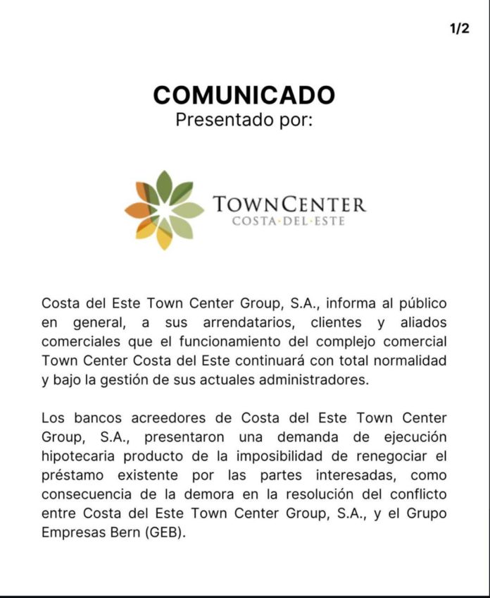 “Costa del Este Town Center Group, S.A., informa al público en general, a sus arrendatarios, clientes y aliados comerciales que el funcionamiento del complejo comercial Town Center Costa del Este continuará con total normalidad y bajo la gestión de sus actuales administradores.